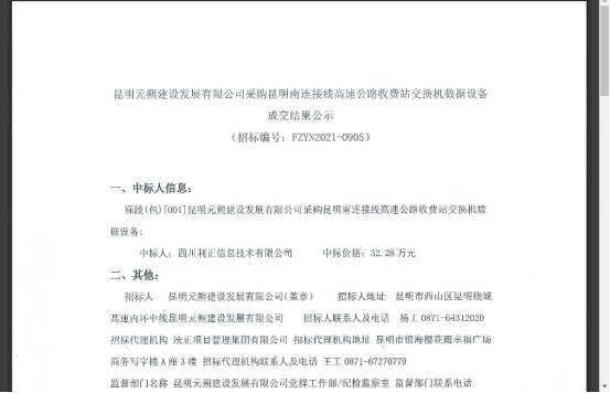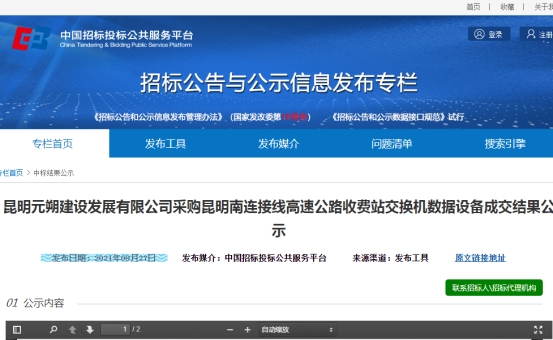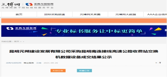 昆明元朔建设发展有限公司采购昆明南连接线高速公路收费站交换机数据设备成交结果公示