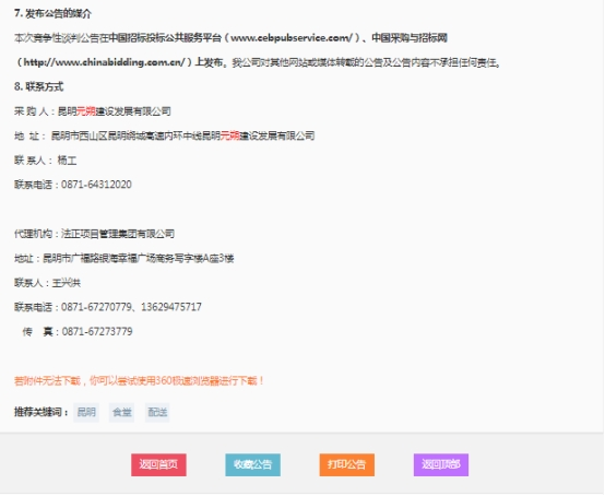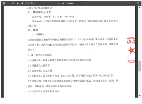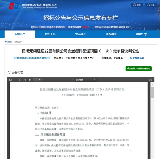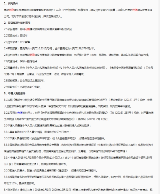 昆明元朔建设发展有限公司食堂餐料配送项目(二次)竞争性谈判公告