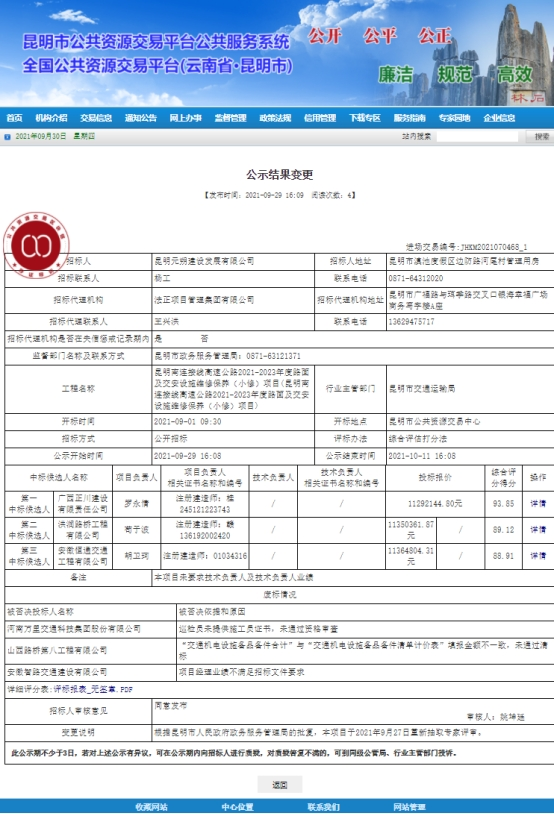昆明南连接线高速公路2021-2023年度路面及交安设施维修保养(小修)项目复核结果公示
