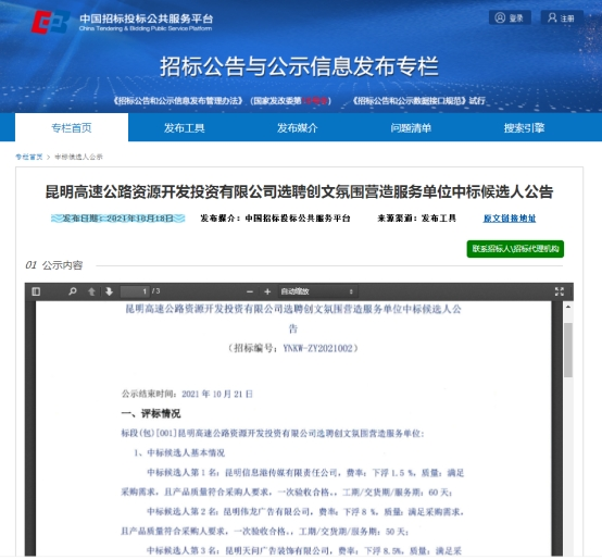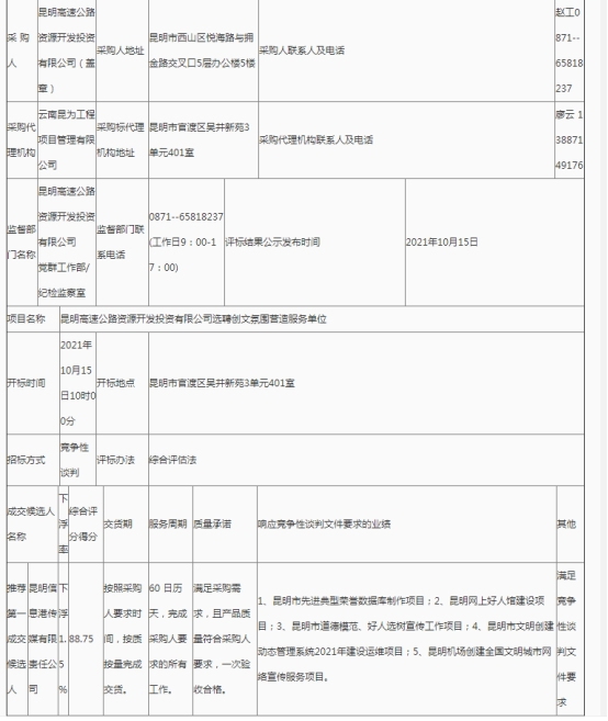 昆明高速公路资源开发投资有限公司选聘创文氛围营造服务单位评审结果公示
