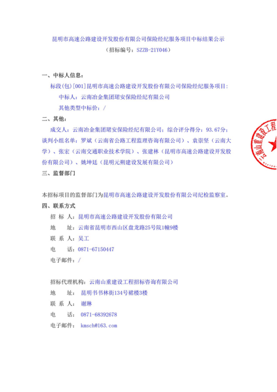 昆明市高速公路建设开发股份有限公司保险经纪服务项目中标结果公示
