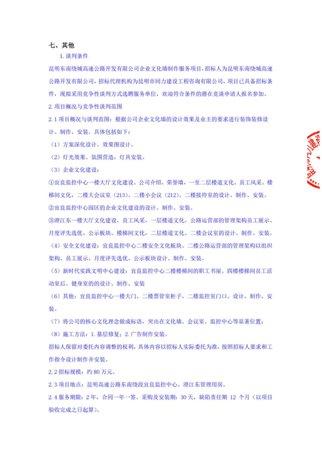 昆明绕城高速公路东南段运营期企业文化墙制作服务竞争性谈判公告