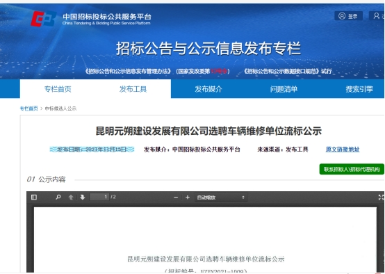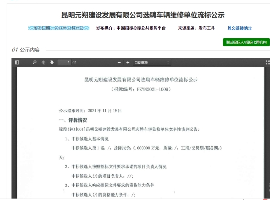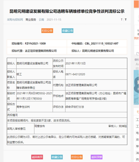 昆明元朔建设发展有限公司选聘车辆维修单位竞争性谈判流标公示