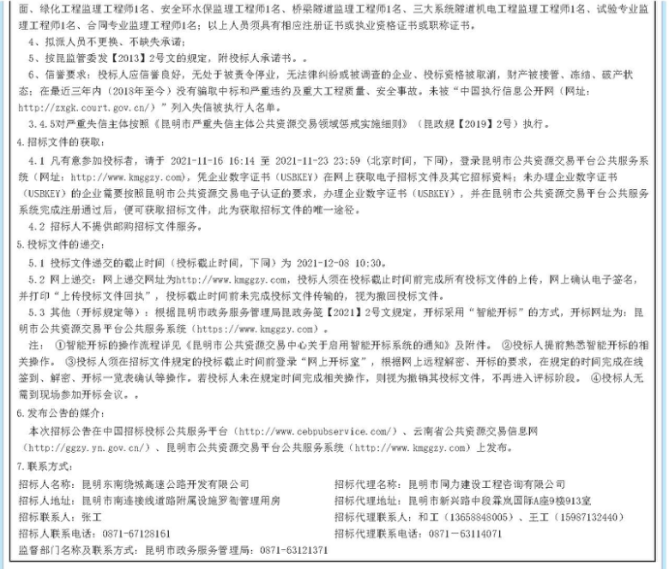 昆明绕城高速公路东南段运营期2021-2023年养护工程、机电设备维护、强电维护等工程监理招标公告