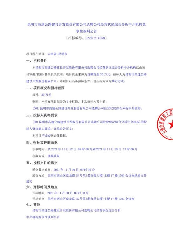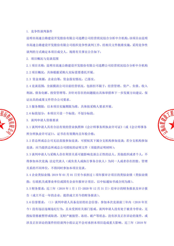 昆明市高速公路建设开发股份有限公司选聘公司经营状况综合分析中介机构竞争性谈判公告