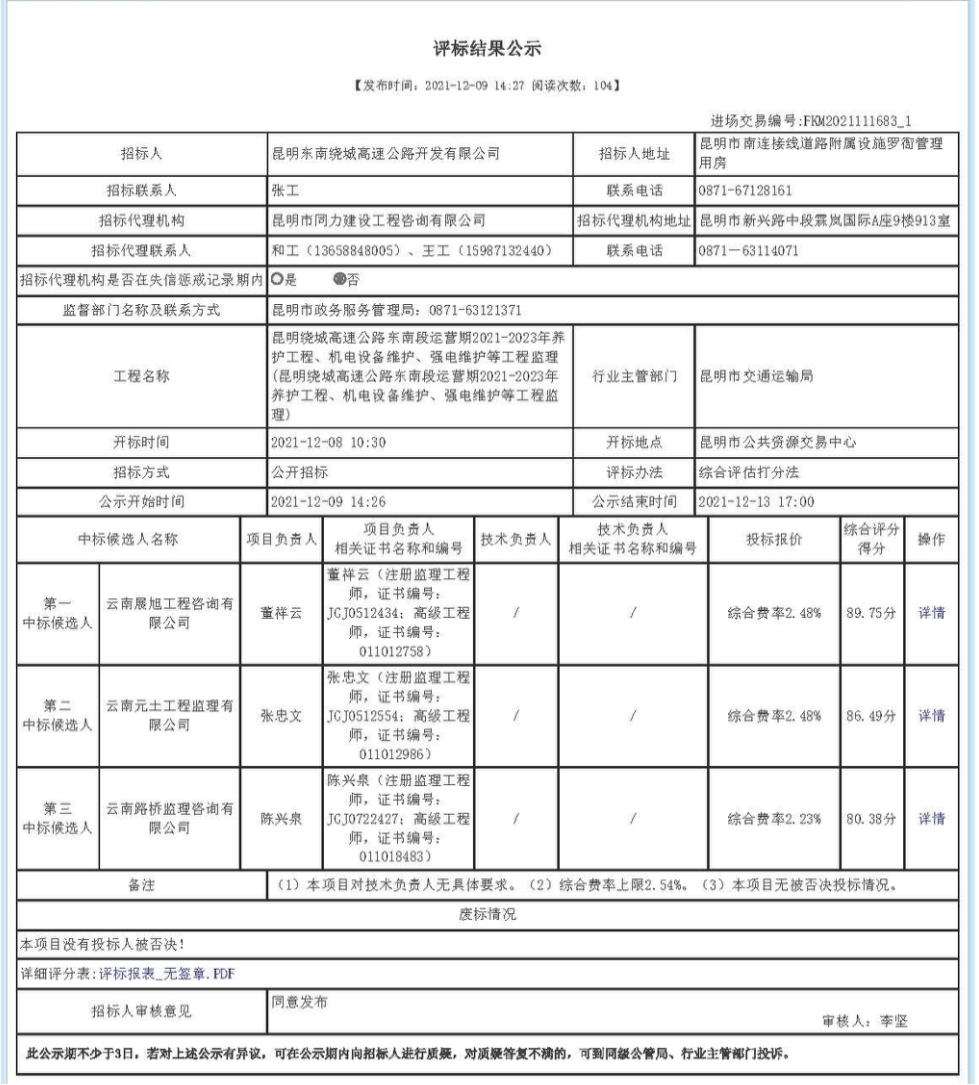 昆明绕城高速公路东南段运营期2021-2023年养护工程、机电设备维护、强电维护等工程监理评标结果公示