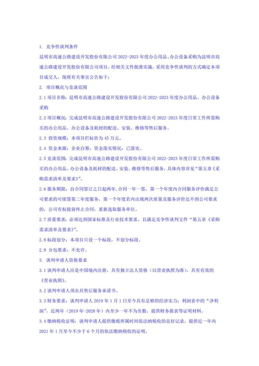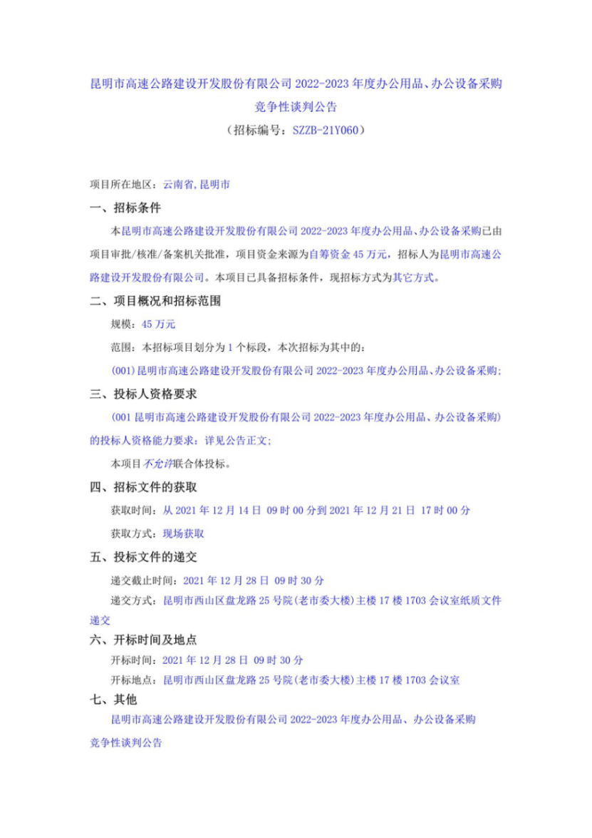 昆明市高速公路建设开发股份有限公司2022-2023年度办公用品、办公设备采购竞争性谈判公告