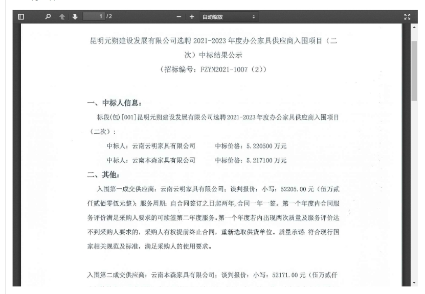 昆明元朔建设发展有限公司选聘2021-2023年度办公家具供应商入围项目(二次)成交结果公示发布信息