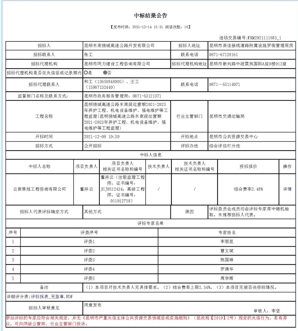 昆明绕城高速公路东南段运营期2021-2023年养护工程、机电设备维护、强电维护等工程监理中标结果公告