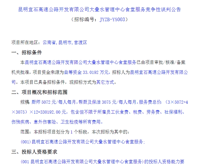 昆明宜石高速公路开发有限公司大叠水管理中心食堂服务竞争性谈判公告