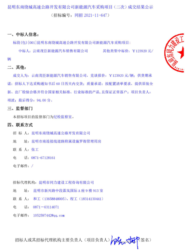 昆明东南绕城高速公路开发有限公司新能源汽车采购项目(二次)成交结果公示