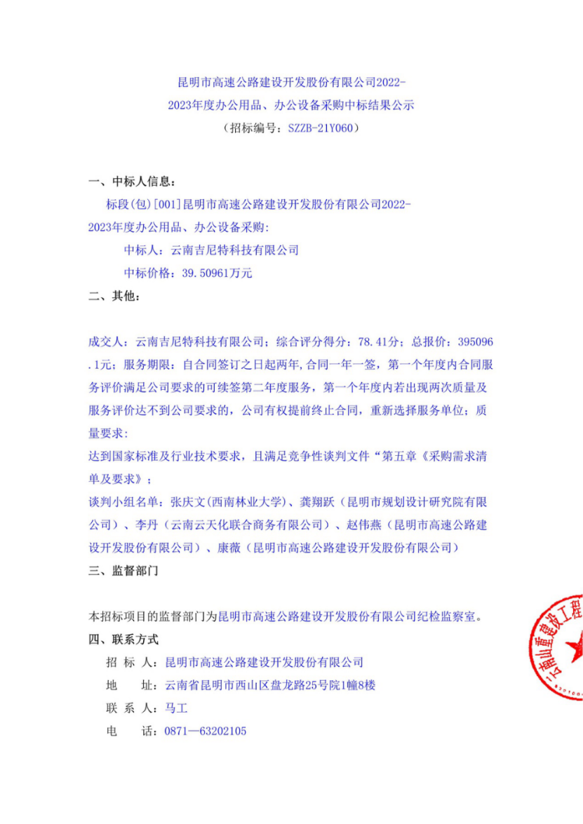 昆明市高速公路建设开发股份有限公司2022-2023年度办公用品、办公设备中标结果公示