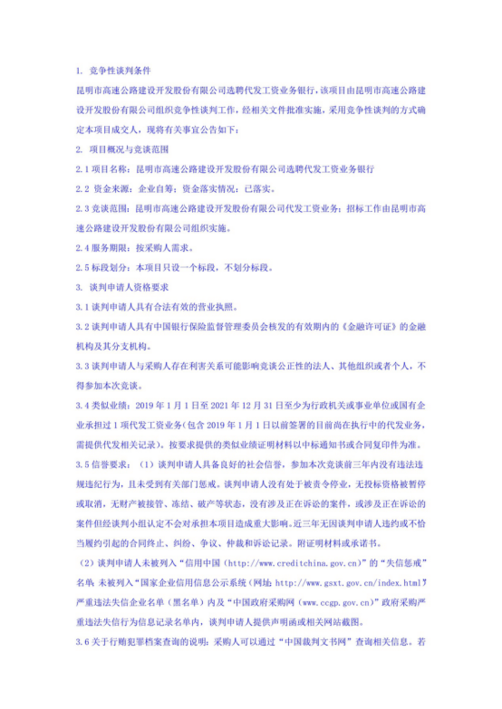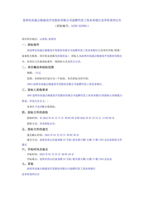 昆明市高速公路建设开发股份有限公司选聘代发工资业务银行竞争性谈判公告