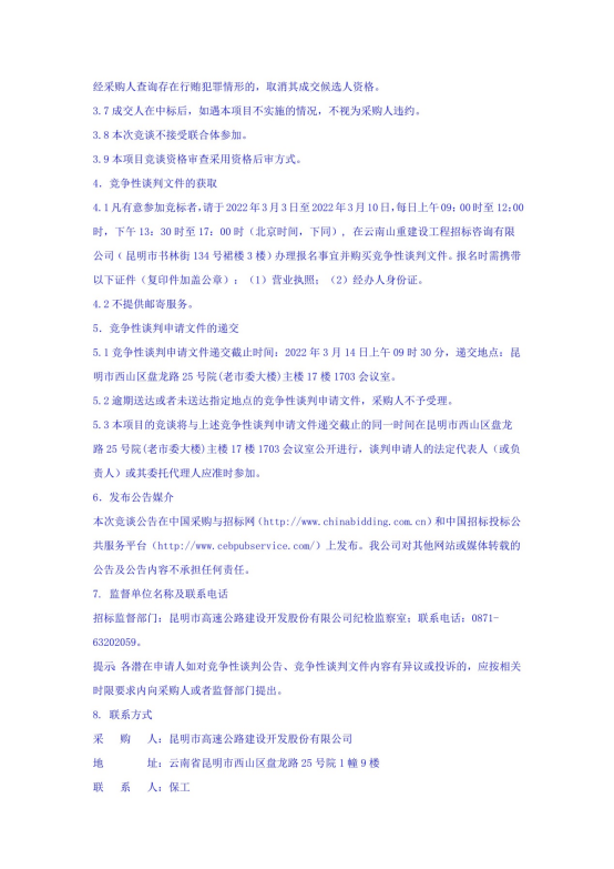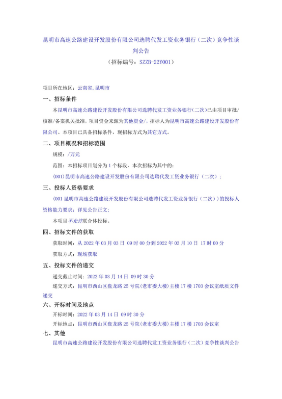 昆明市高速公路建设开发股份有限公司选聘代发工资业务银行(二次)竞争性谈判公告