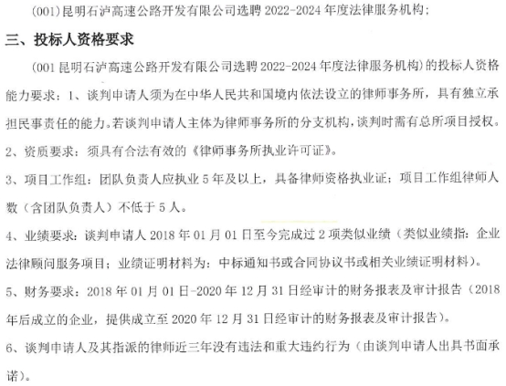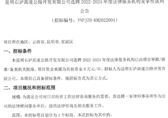 昆明石泸高速公路开发有限公司选聘2022-2024年度法律服务机构竞争性谈判公告