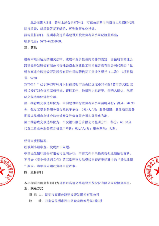 昆明市高速公路建设开发股份有限公司选聘代发工资业务银行(二次)中标候选人公示