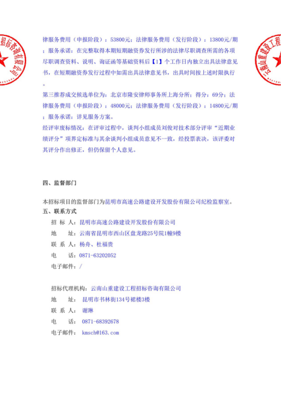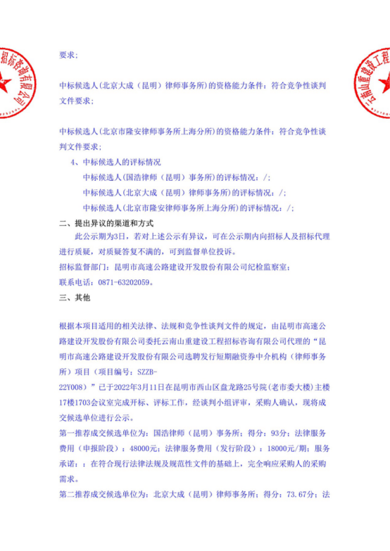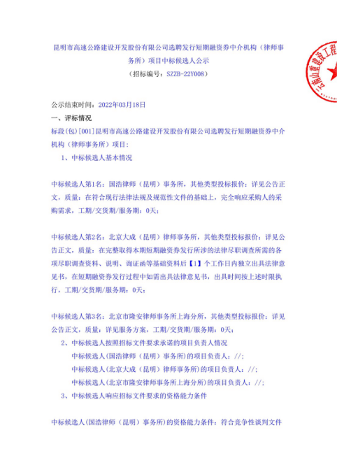 昆明市高速公路建设开发股份有限公司选聘发行短期融资券中介机构(律师事务所)项目中标候选人公示