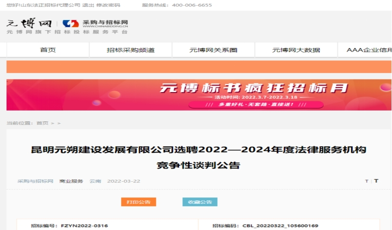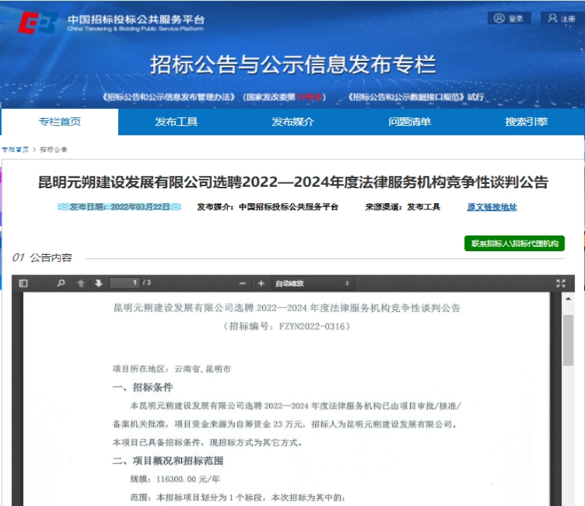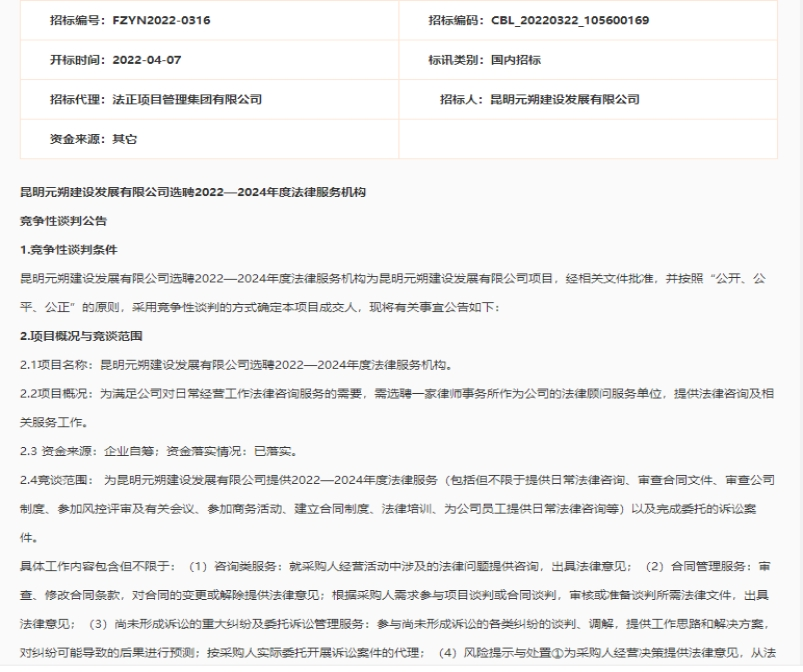 昆明元朔建设发展有限公司选聘2022—2024年度法律服务机构竞争性谈判公告