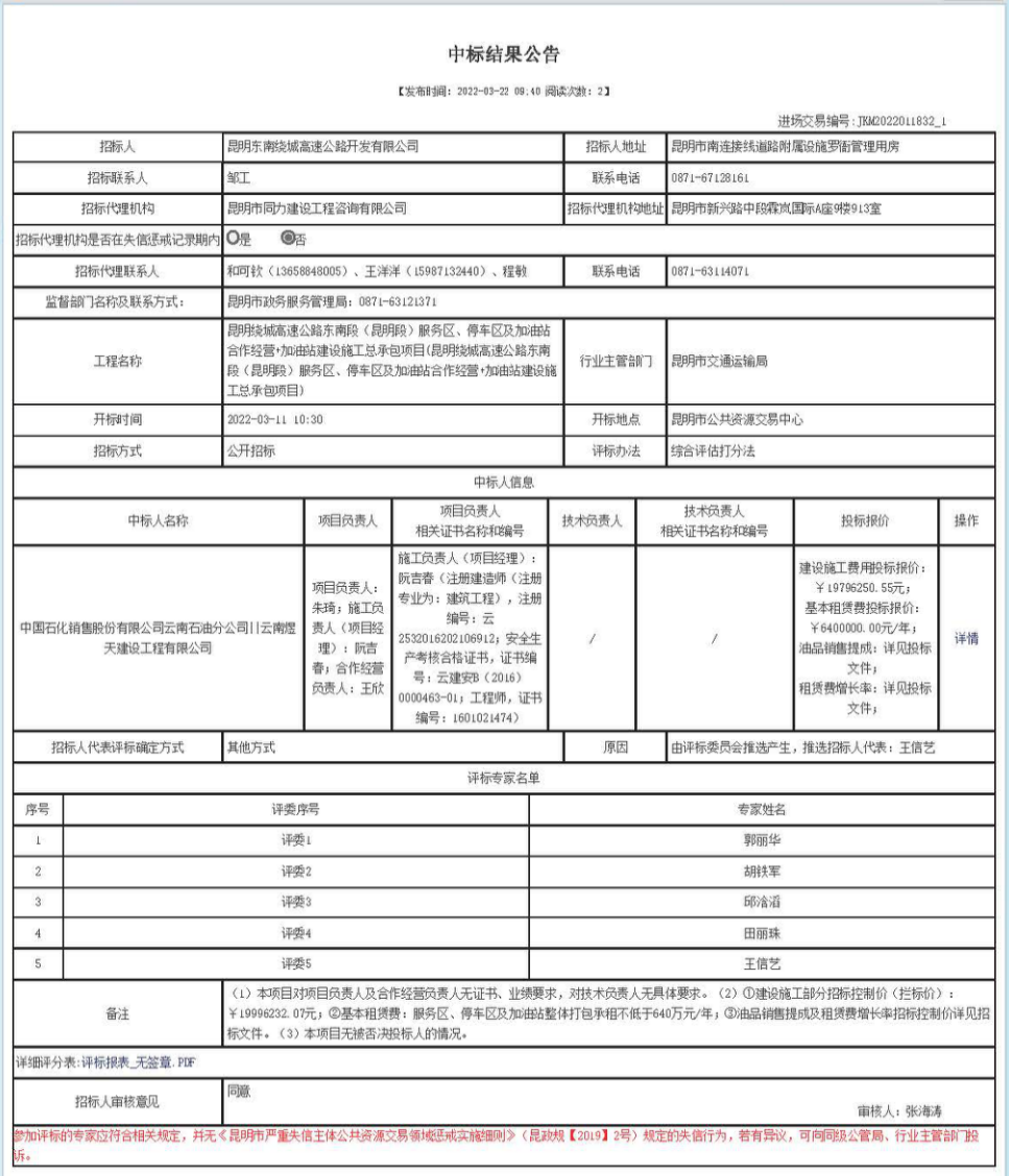 昆明绕城高速公路东南段(昆明段)服务区、停车区及加油站合作经营+加油站建设施工总承包项目中标结果公告