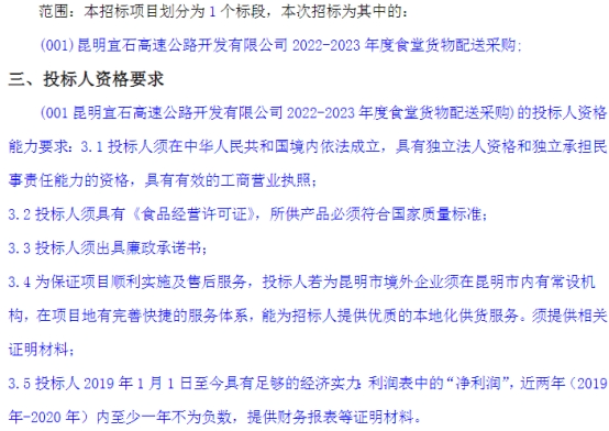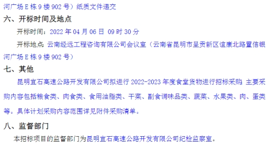 昆明宜石高速公路开发有限公司 2022-2023年度食堂货物配送采购竞争性谈判公告