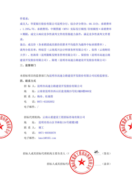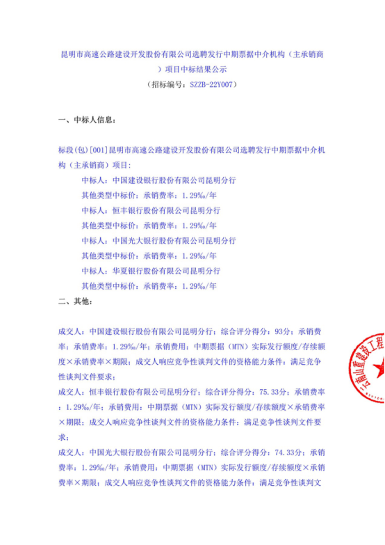 昆明市高速公路建设开发股份有限公司选聘发行中期票据中介机构(主承销商)项目中标结果公示