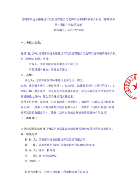 昆明市高速公路建设开发股份有限公司选聘发行中期票据中介机构(律师事务所)项目中标结果公示