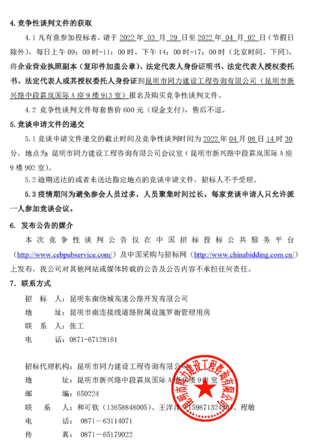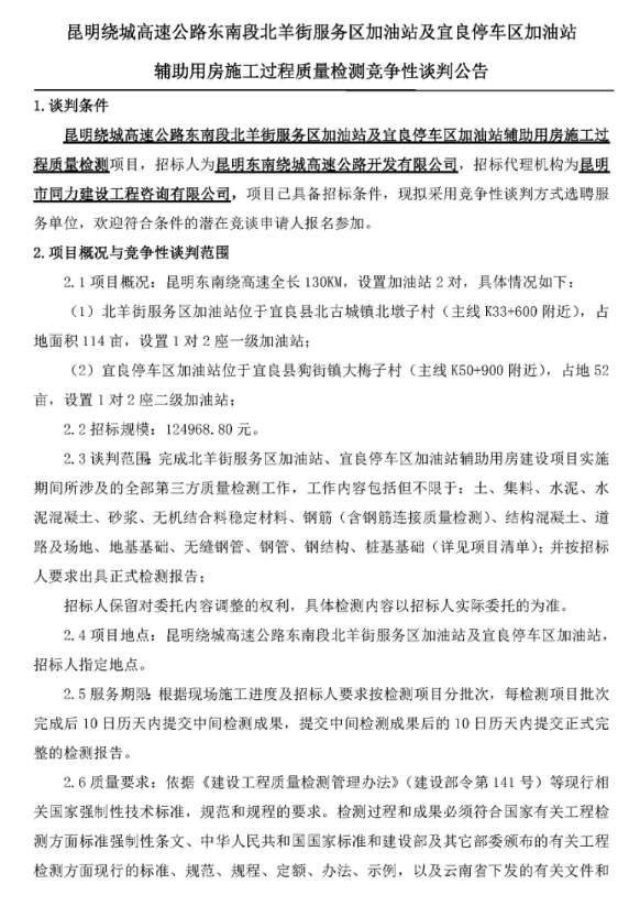 昆明绕城高速公路东南段北羊街服务区加油站及宜良停车区加油站辅助用房施工过程质量检测竞争性谈判公告