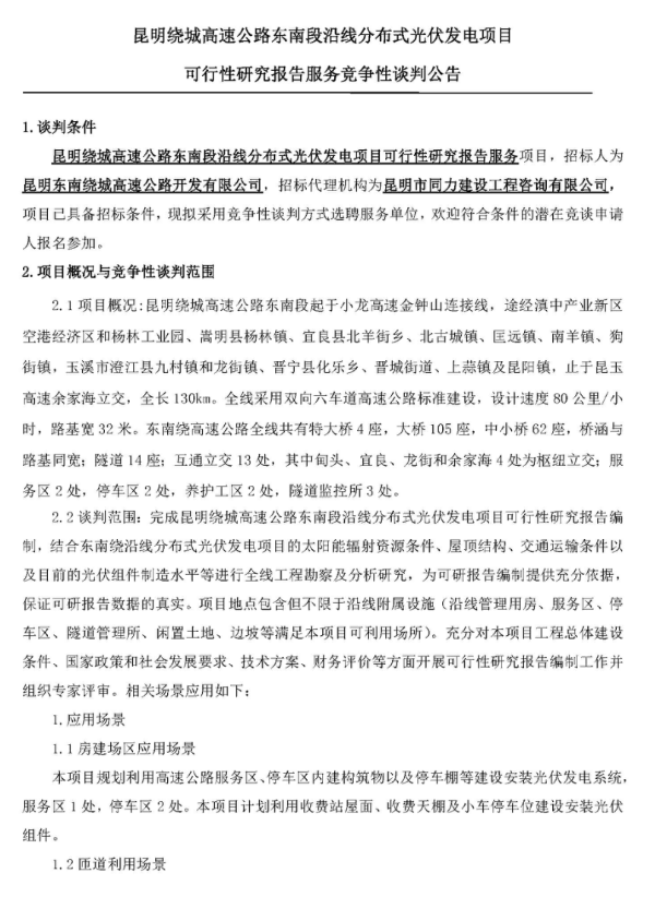 昆明绕城高速公路东南段沿线分布式光伏发电项目可行性研究报告编制单位竞争性谈判公告