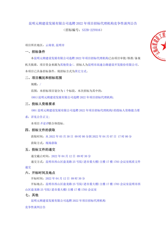 昆明元朔建设发展有限公司选聘2022年项目招标代理机构竞争性谈判公告