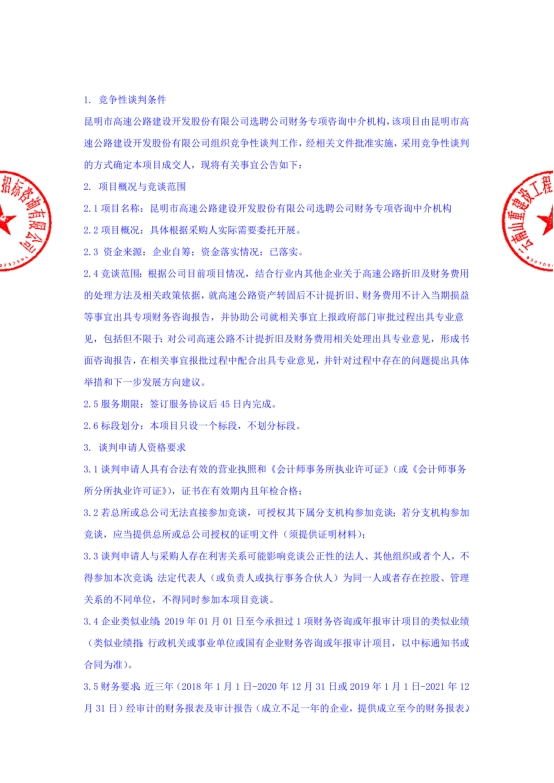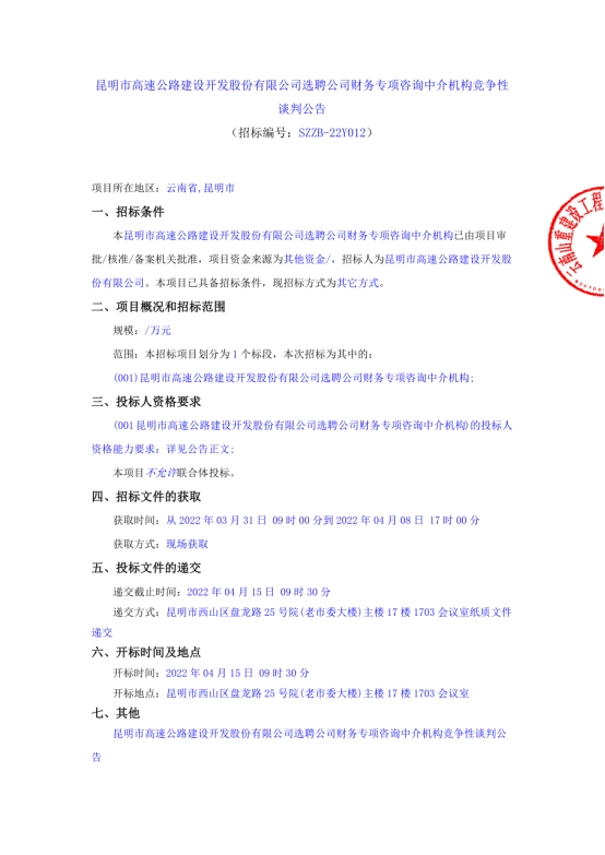 昆明市高速公路建设开发股份有限公司选聘公司财务专项咨询中介机构竞争性谈判公告
