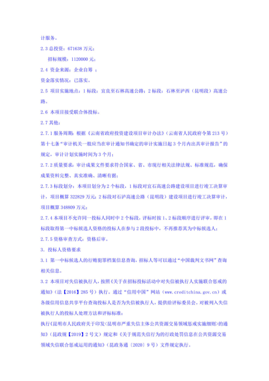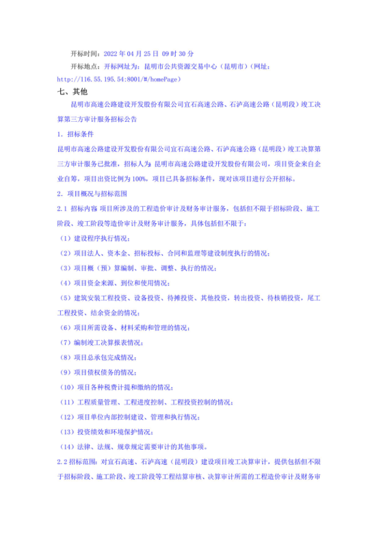 昆明市高速公路建设开发股份有限公司宜石高速公路、石泸高速公路(昆明段)竣工决算第三方审计服务招标公告