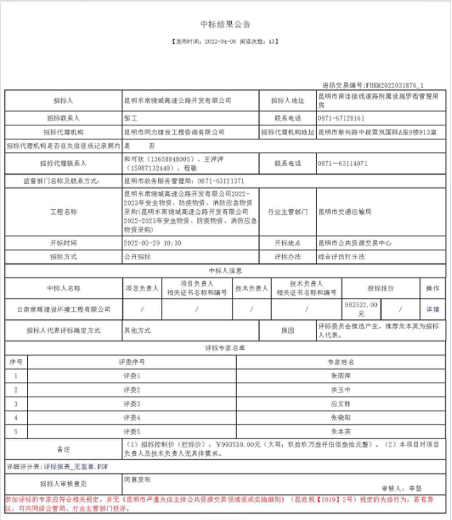 昆明东南绕城高速公路开发有限公司2022-2023年安全物资、防疫物资、消防应急物资采购中标结果公告