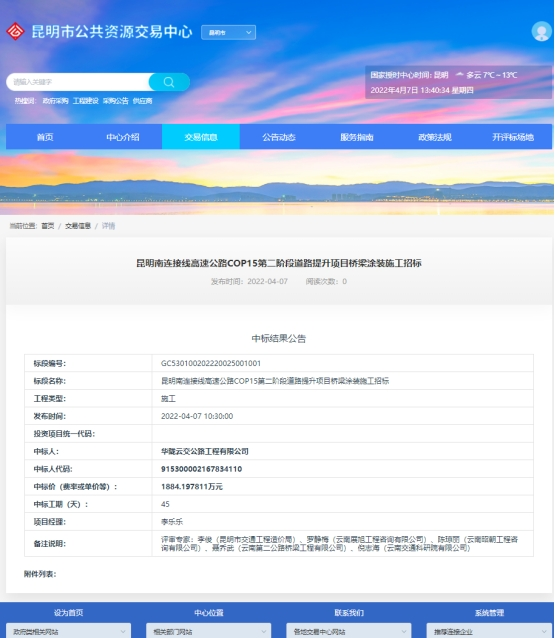 昆明南连接线高速公路COP15第二阶段道路提升项目施工项目中标结果公示(中国招标投标公共服务平台,点击可查看)