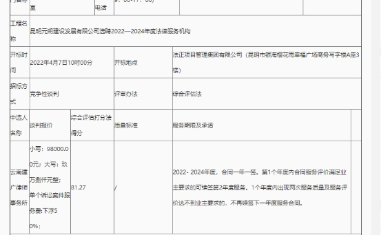 昆明元朔建设发展有限公司选聘2022-2024年度法律服务机构中标结果公示