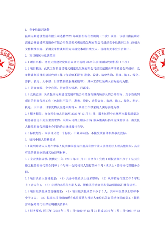 昆明元朔建设发展有限公司选聘2022年项目招标代理机构(二次)竞争性谈判公告