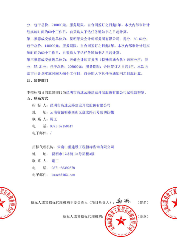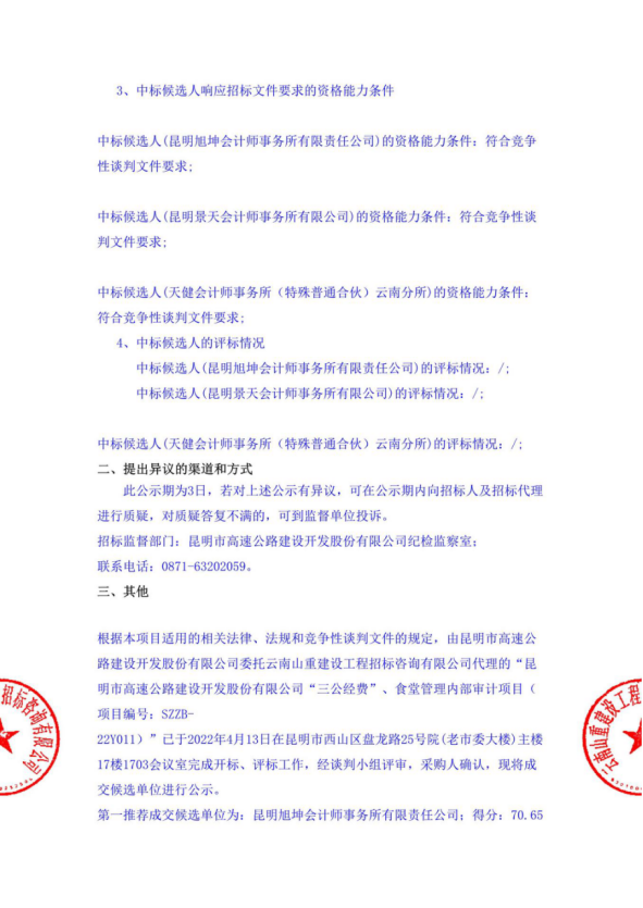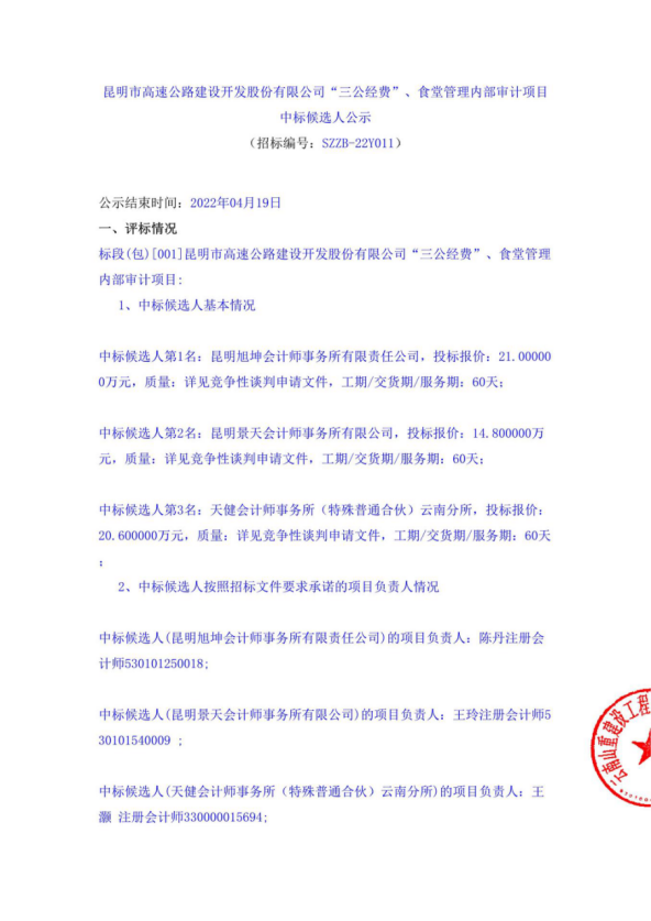 昆明市高速公路建设开发股份有限公司“三公经费”、食堂管理内部审计项目中标候选人公示