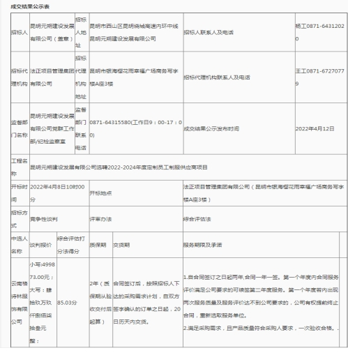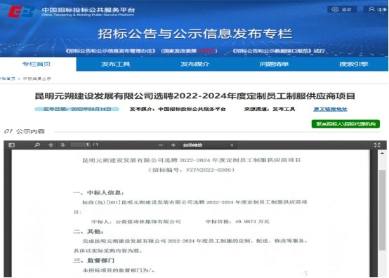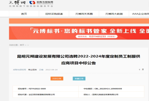 昆明元朔建设发展有限公司选2022-2024年度定制员工制服供应商项目中标结果公示