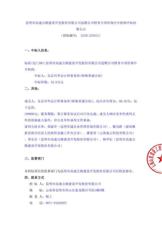 昆明市高速公路建设开发股份有限公司选聘公司财务专项咨询中介机构中标结果公示