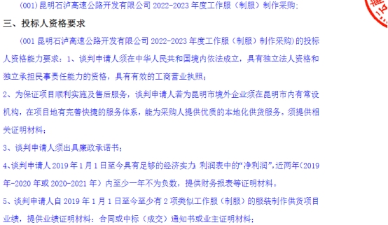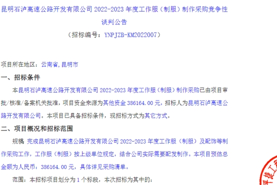 昆明石泸高速公路开发有限公司2022-2023年度工作服(制服)制作采购竞争性谈判公告