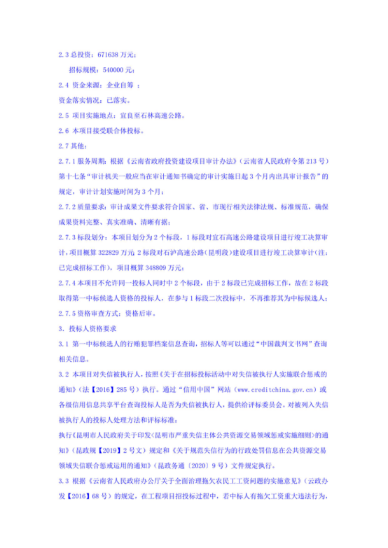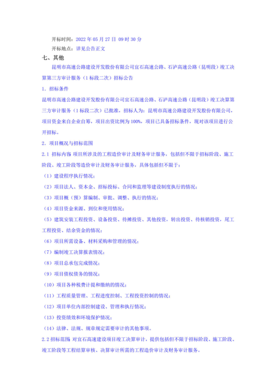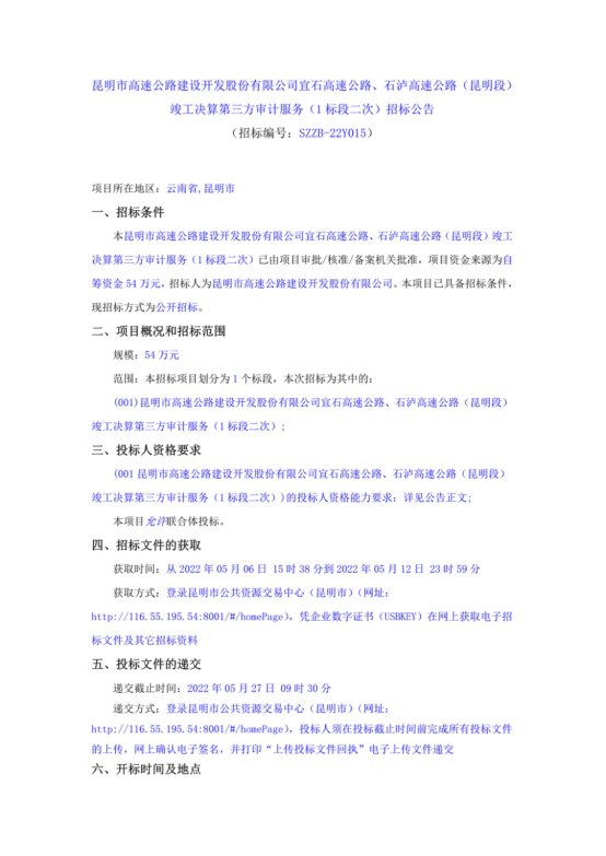 昆明市高速公路建设开发股份有限公司宜石高速公路、石泸高速公路(昆明段)竣工决算第三方审计服务(1标段二次)招标公告