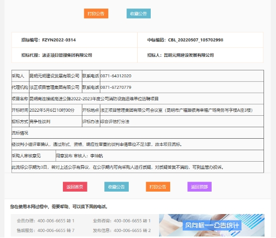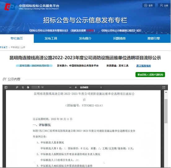 昆明南连接线高速公路2022-2023年度公司消防设施运维单位选聘项目流标公示
