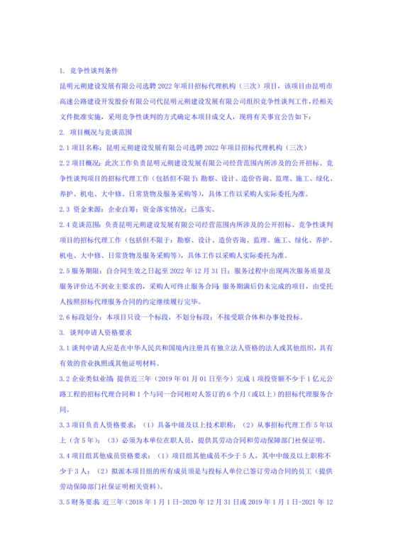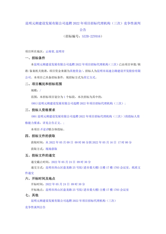 昆明元朔建设发展有限公司选聘2022年项目招标代理机构(三次)竞争性谈判公告