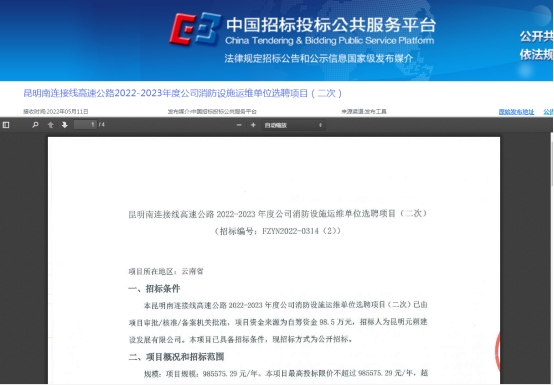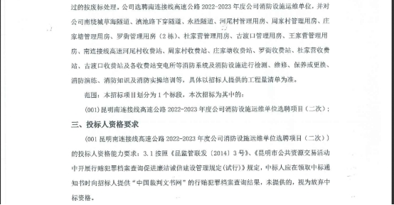 昆明南连接线高速公路2022-2023年度公司消防设施运维单位选聘项目(二次)竞争性谈判公告