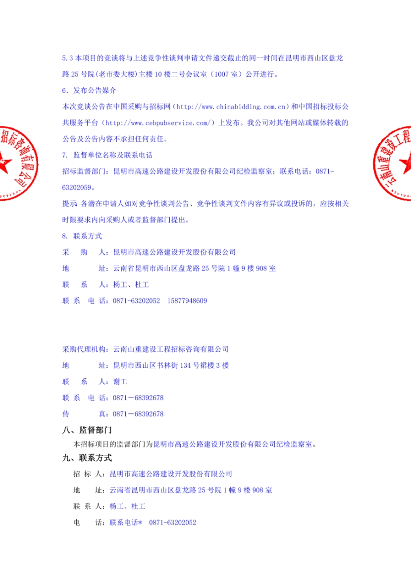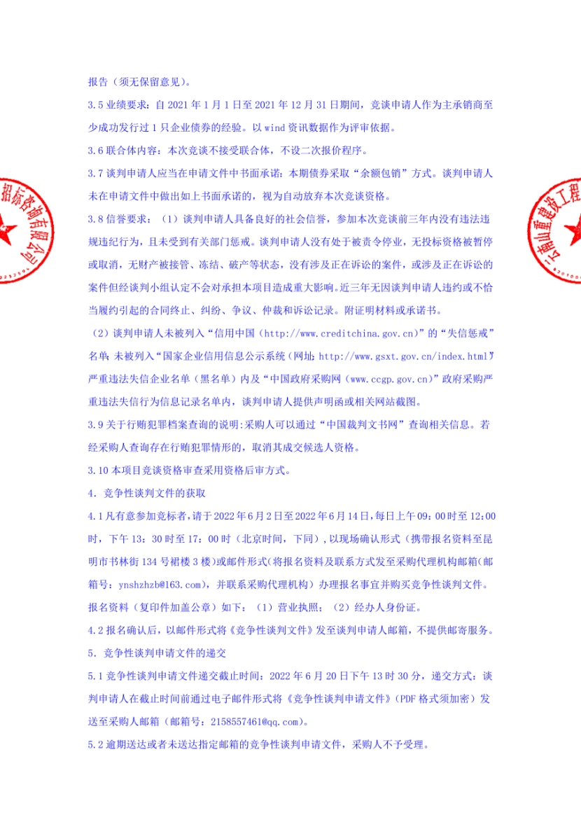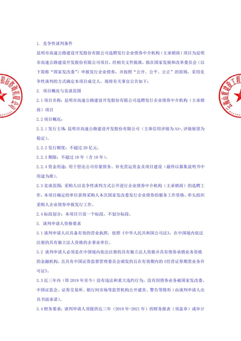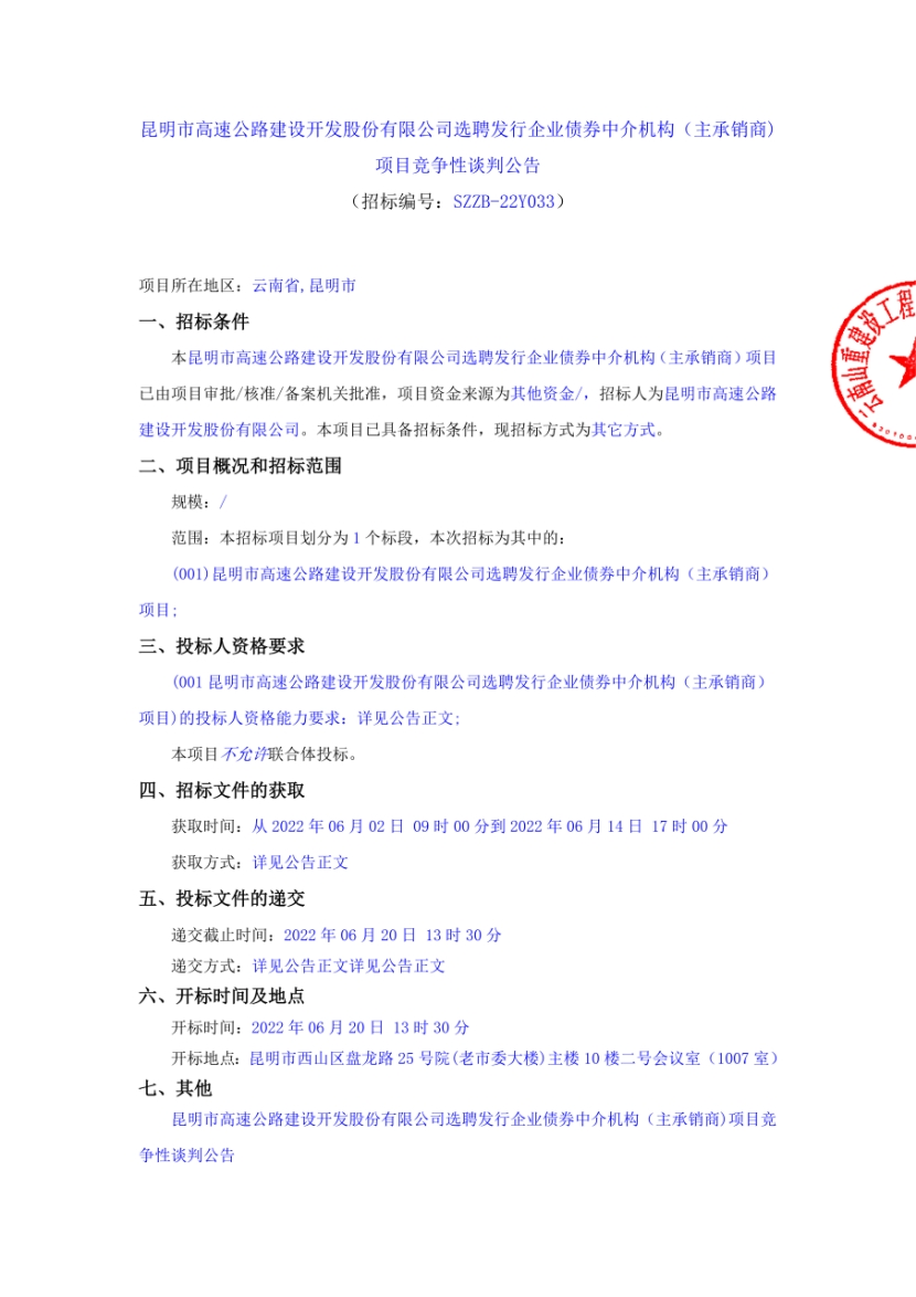 昆明市高速公路建设开发股份有限公司选聘发行企业债券中介机构(主承销商)项目竞争性谈判公告