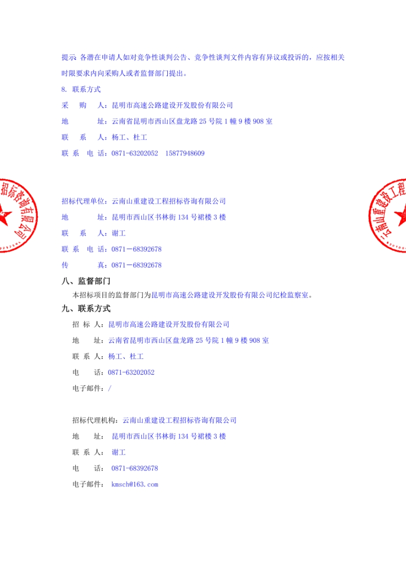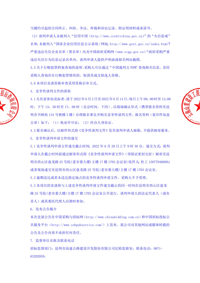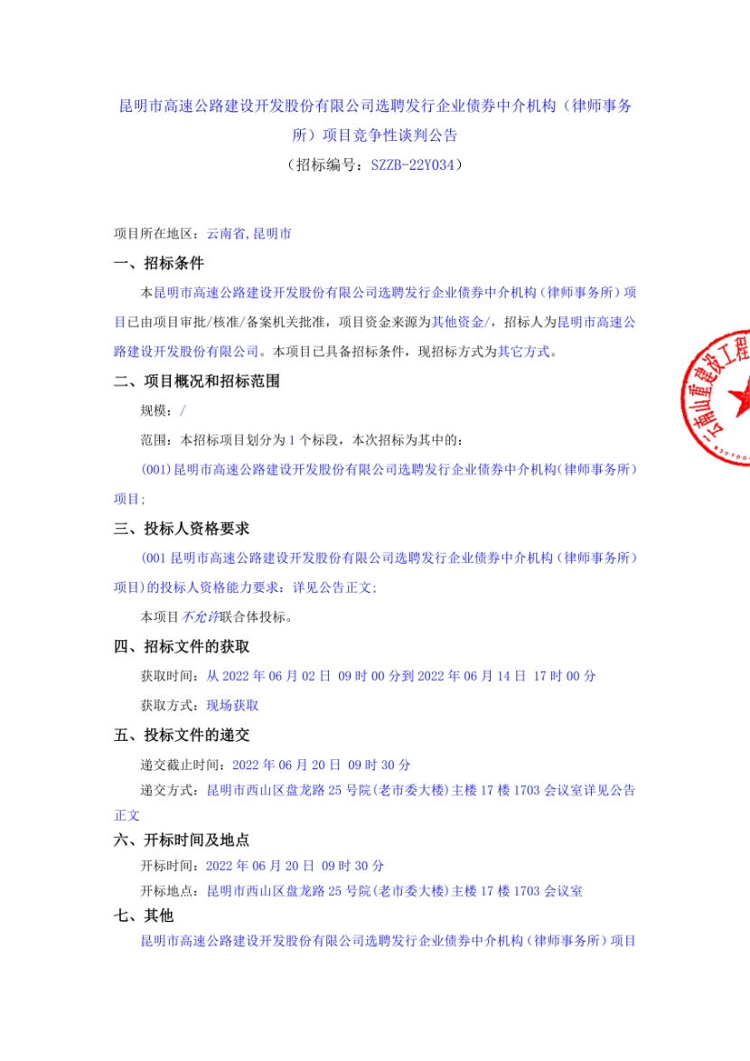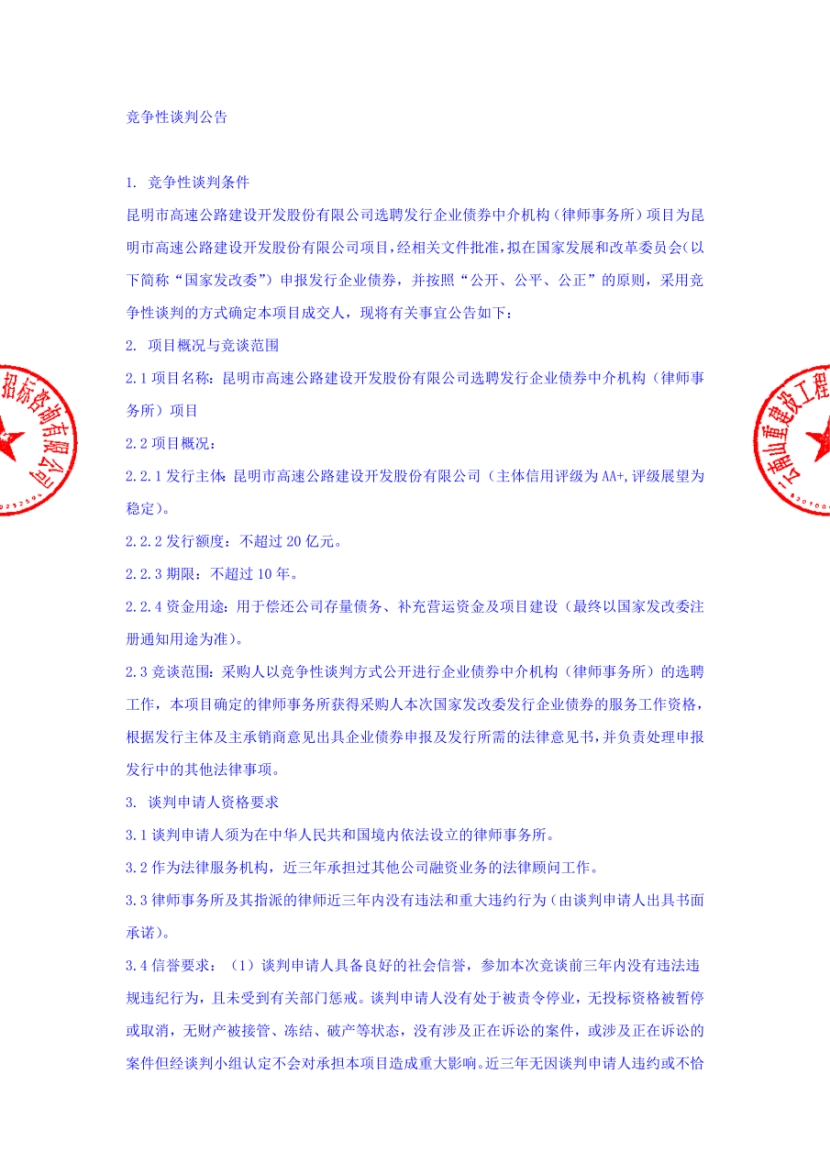 昆明市高速公路建设开发股份有限公司选聘发行企业债券中介机构(律师事务所)项目竞争性谈判公告