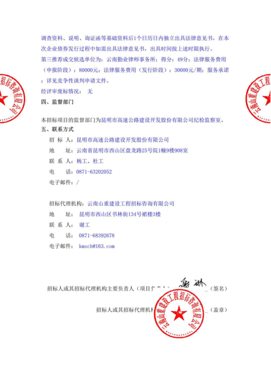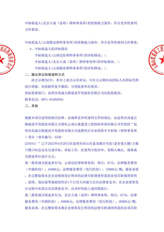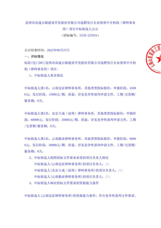 昆明市高速公路建设开发股份有限公司选聘发行企业债券中介机构(律师事务所)项目中标候选人公示