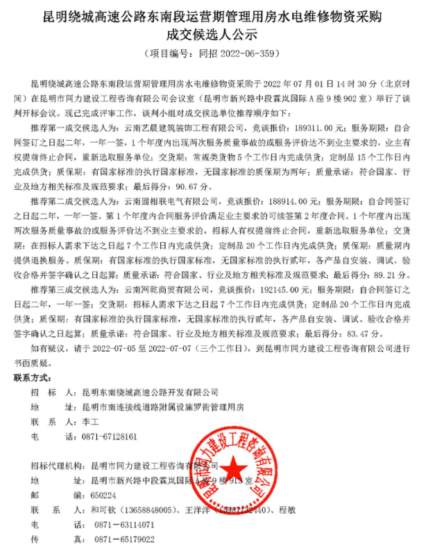 昆明绕城高速公路东南段运营期管理用房水电维修物资采购成交候选人公示