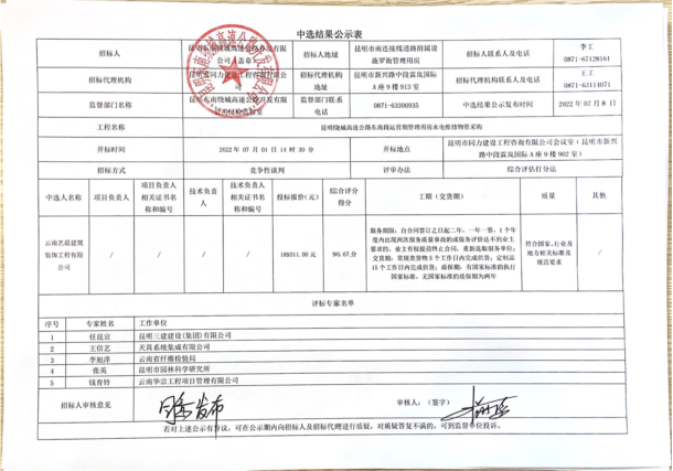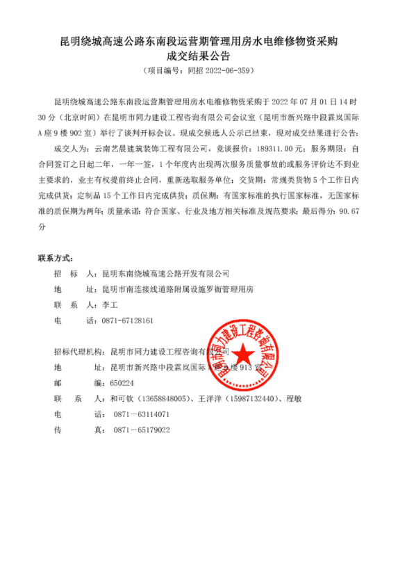 昆明绕城高速公路东南段运营期管理用房水电维修物资采购成交结果公告