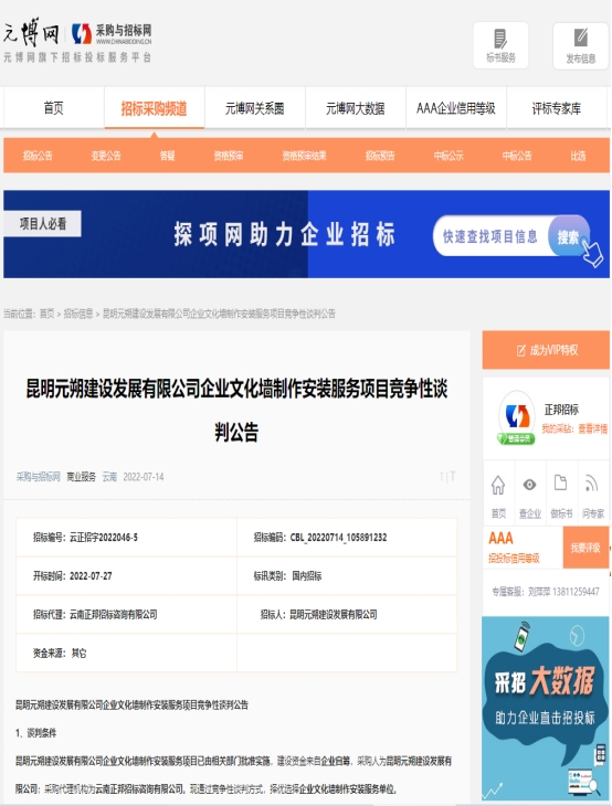 昆明元朔建设发展有限公司企业文化墙制作安装服务项目竞争性谈判公告