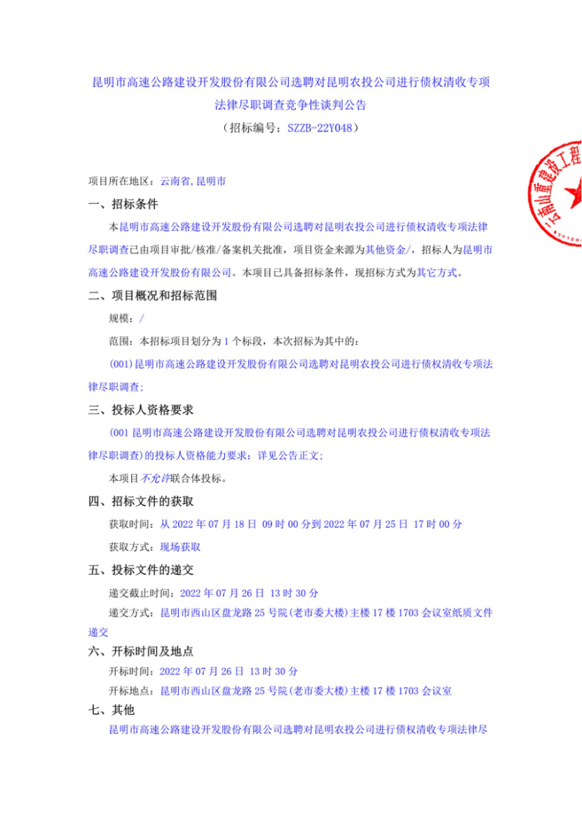 昆明市高速公路建设开发股份有限公司选聘对昆明农投公司进行债权清收专项法律尽职调查竞争性谈判公告